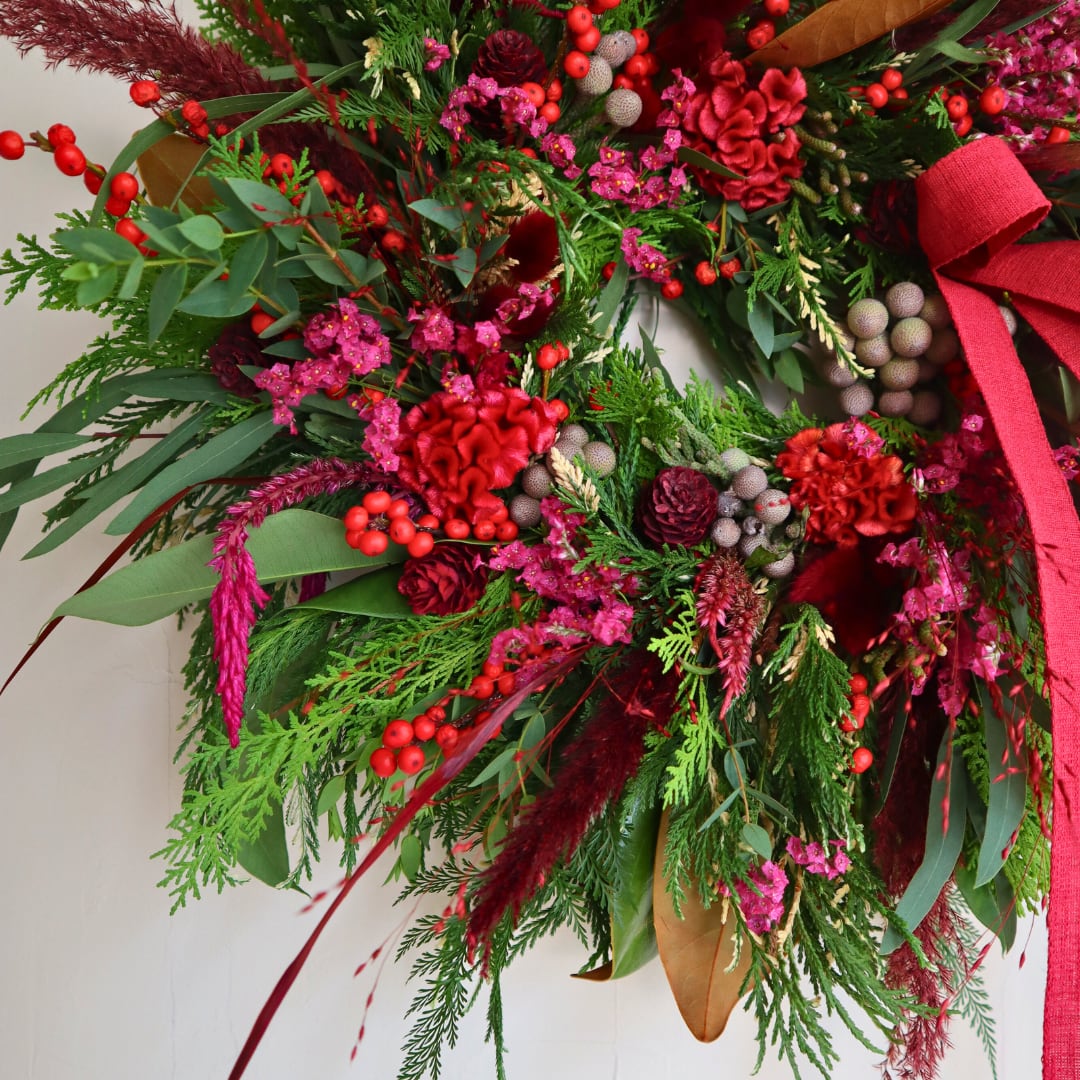 赤い花と実、そしてドライフラワーをふんだんに使ってアレンジした豪華なクリスマスリースです。