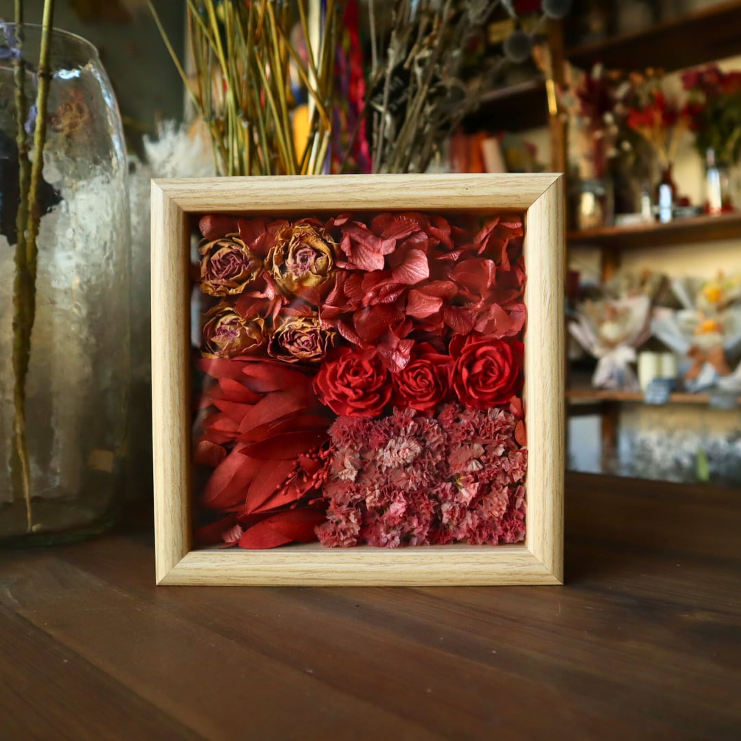 赤いドライフラワーとプリザーブドフラワーをフレームに隙間なくアレンジしたアート作品です。上下左右は無く、自由な向きで飾って頂けます。